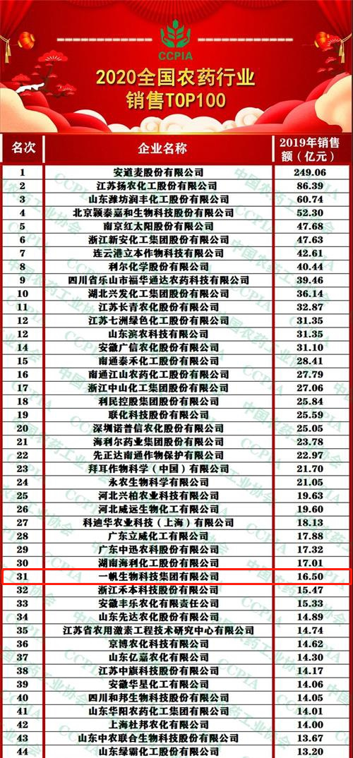一帆生物榮列第31強(qiáng)! 2020全國(guó)農(nóng)藥行業(yè)銷售TOP100發(fā)布 |