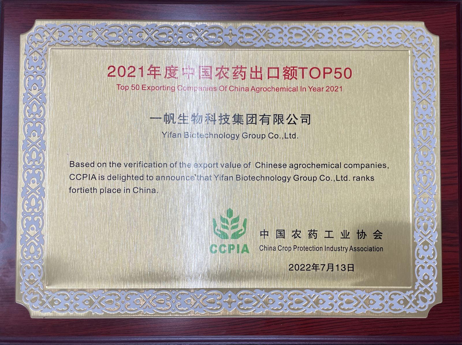 2022年7月13日,在“第九屆中國(guó)植物保護(hù)產(chǎn)品國(guó)際貿(mào)易發(fā)展論壇”上,中國(guó)農(nóng)藥工業(yè)協(xié)會(huì)國(guó)際貿(mào)易委員會(huì)發(fā)布2021年度“中國(guó)農(nóng)藥出口額Top 50”榜單,一帆生物榮列榜單第40位。