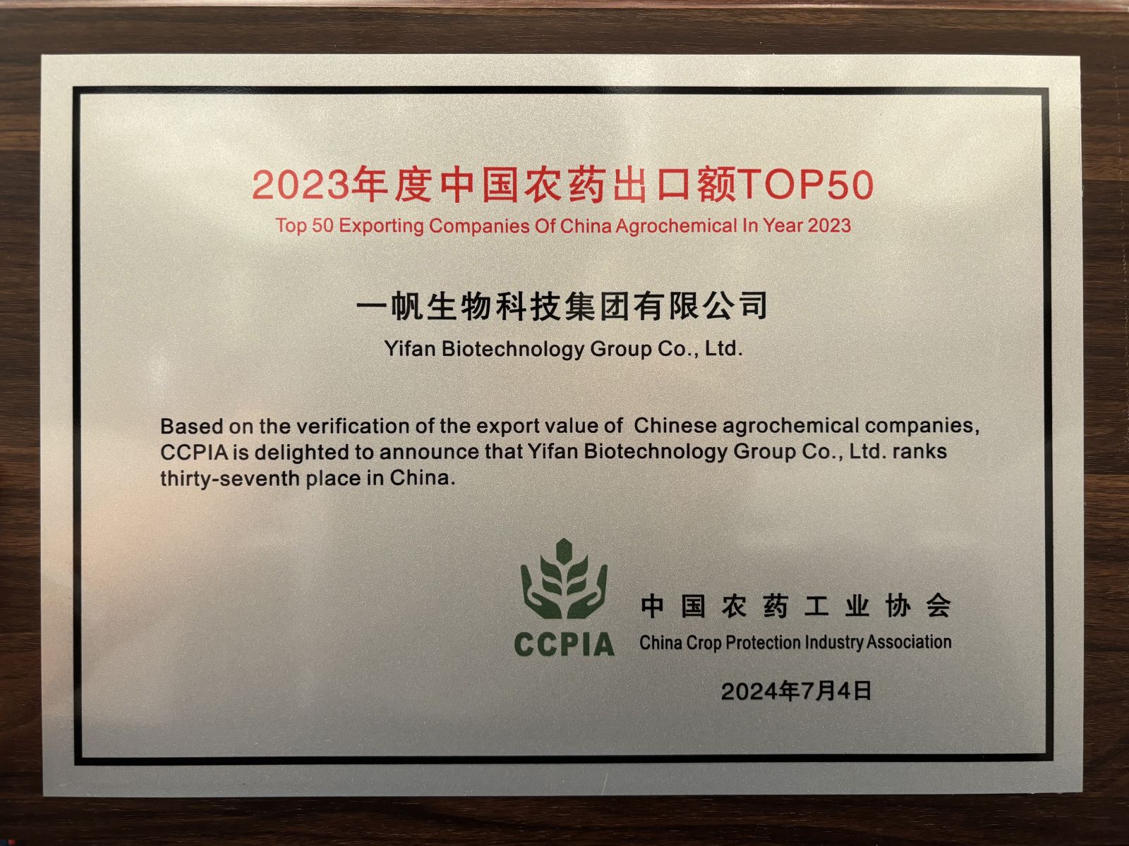 2024年7月4日,第十一屆中國植物保護(hù)產(chǎn)品國際貿(mào)易發(fā)展論壇在南京召開。論壇上, 中國農(nóng)藥工業(yè)協(xié)會(huì)發(fā)布2023年度“中國農(nóng)藥出口額Top50”,一帆生物榮登榜單,位列第37名。