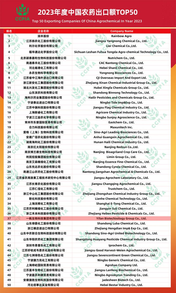 喜報(bào)!一帆榮登2023年度中國農(nóng)藥出口額TOP50榜單 |